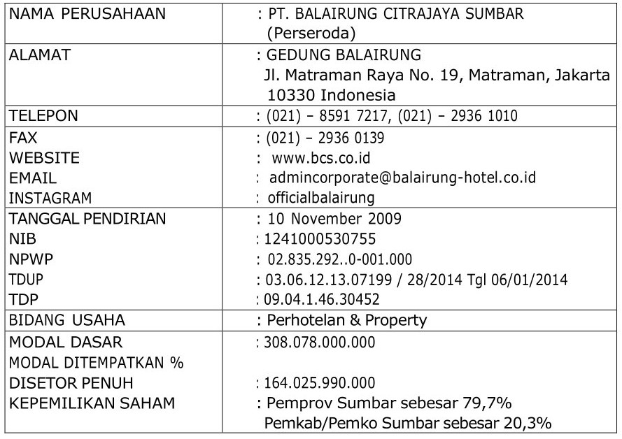 i. Dasar Hukum Perusahaan berdiri atas dasar hukum berupa Peraturan Daerah (Perda) Prov Sumatera Barat Nomor 6 tahun 2009 tanggal 26 Agustus 2009 tentang pendirian Perseroan Terbatas (PT) Balairung Citrajaya Sumbar.